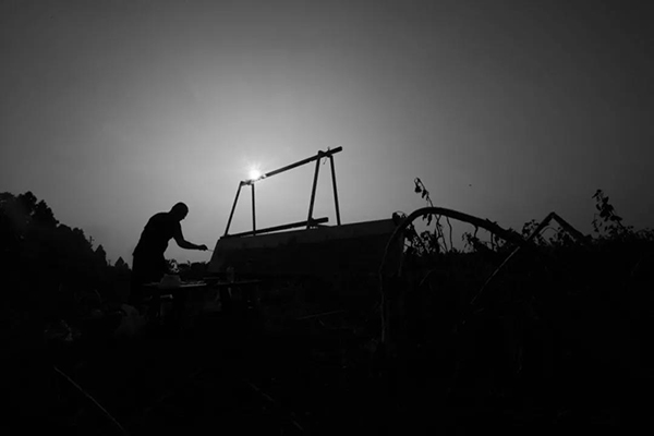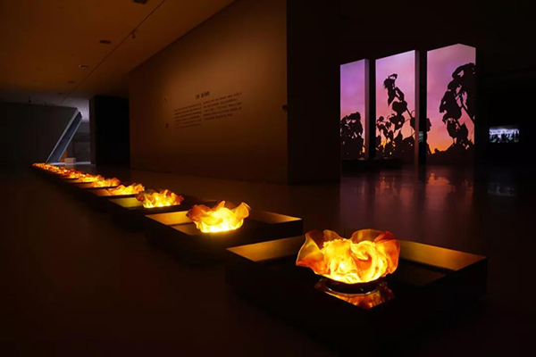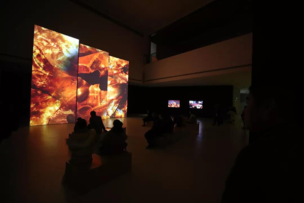 「生醉·流火如歌」呈现的是一组题为《葵颂》的影像新作,展现出一道道峥嵘昂扬、霓光灿灿的绮丽景观。顶天立地的三重屏上,铜葵雕塑火热的锻造过程与苍茫清寂的葵原影像一唱三叹,交错、叠压、铺张。铜葵的锻造凝重奇崛、激烈雄壮,于铁打钢烧间炼就赤壑,于风炙火燎间锻铸洪钟。葵原大地无涯无际、苍凉寂寥,于地平线的延展中逶迤万里山河。