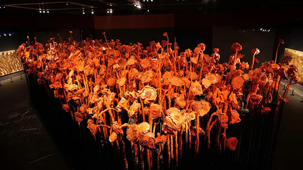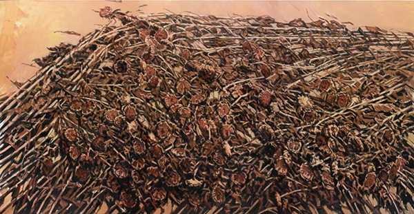 「共生·草木寄人心」由1600株葵杆组成的雕塑《共生》与13幅大型油画组成。大厅中一片黑压压的葵林訇然耸立,则如同暗夜中的流火,奔涌,升腾。天幕下,群葵冉冉升起,织就红云漫天的葵颂交响。在空间中、在画面上,充斥着的是不屈的葵之肉身,是人与民的群像。这些向日葵们聚集在一起,一丛丛、一簇簇,相互支撑,彼此呼应,或为列兵般精神抖擞的「葵阵」,或为叠加堆积火焰般升腾的「金塔」,或为两军对垒短兵相接的「断壑」,或为泥沙俱下雄壮苍凉的「狂飙」……这无数葵的身躯铸炼为具有强烈视觉冲击的形式意态,凝筑为蕴育化生、承载万物的山河大地。