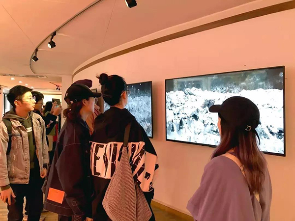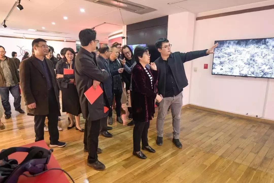 跨媒体艺术学院举办的“科艺先锋”——庆祝中华人民共和国成立70周年艺术创作实践展现场,本次策展人为学校领导导览