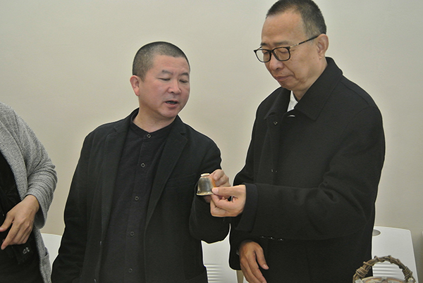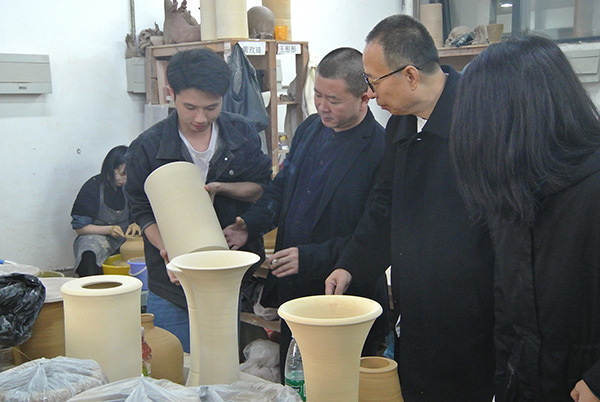 参观展览后,委员们走访了中国美术学院手工艺术学院陶瓷、玻璃、金工、漆艺专业的实验室,了解了中国美术学院手工艺术学院特色的“链状工作坊教学模式”。该模式是跟手工艺术创作规律紧密相联的一种教学模式,依据手工艺术创作自身的流程与工序,环环相扣,有利于学生掌握材料特性和创作规律。以该模式为核心的课题《基于专业链状工作坊的工艺美术创新创意人才培养的探索与实践》于今年获得了国家级教学成果一等奖。“手工艺术创作方法研究”正是基于这一链状工作坊模式的“金课”。