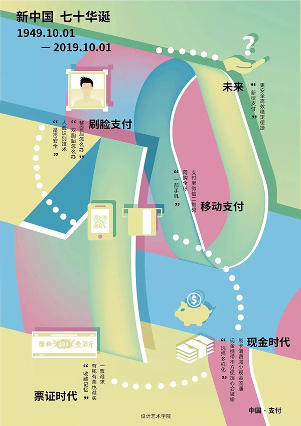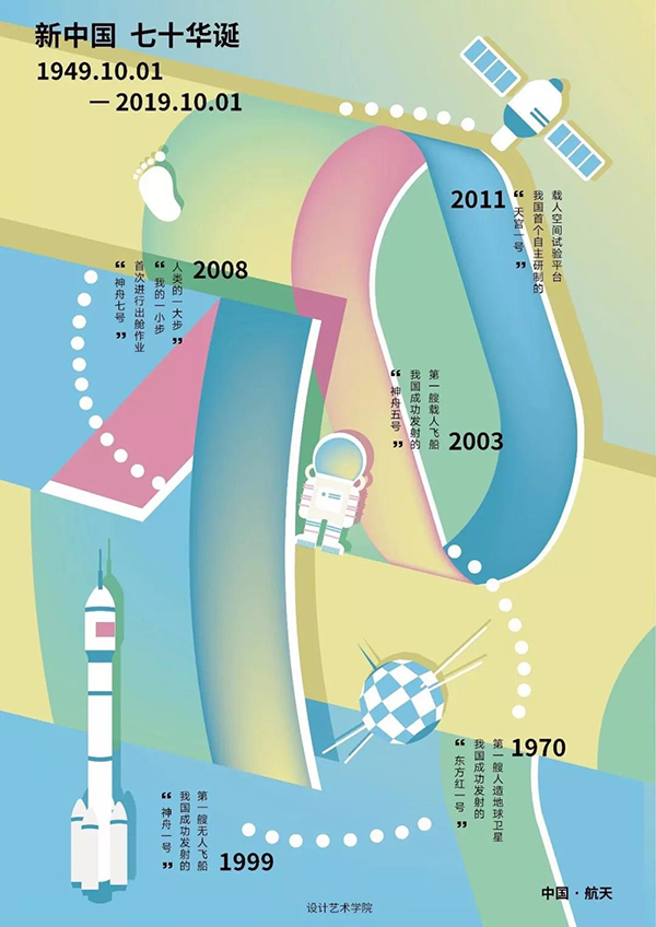 设计艺术学院党总支发起的“壮丽70年 奋斗新时代” 主题海报征集活动作品《航天、交通、支付》作者:金洁如