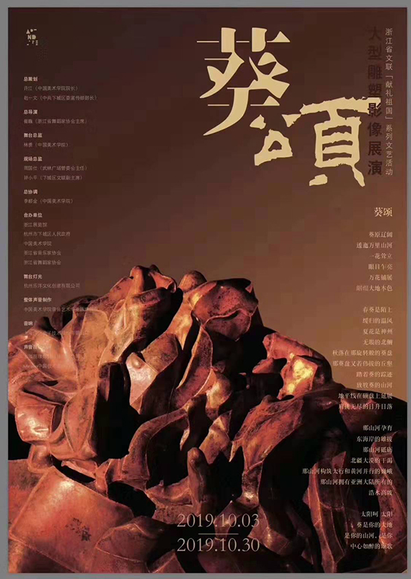 「葵颂」大型雕塑影像展演◎ 时 间:2019年10月3日至10月30日◎ 地 点:杭州武林广场◎ 主 办:浙江省文学艺术界联合会 / 中国美术学院 / 中共杭州市委宣传部◎ 合 办:浙江省音乐家协会 / 浙江省舞蹈家协会◎ 承 办:浙江省文化会堂(浙江展览馆) / 杭州市下城区人民政府 /中国美术学院雕塑与公共艺术学院 葵颂大型雕塑影像展示创作团队 总策划:许江(中国美术学院院长)、赵一文(中共下城区委宣传部部长)总导演:崔巍(浙江省舞蹈家协会主席)舞台总监:林勇(中国美术学院)现场总监:周国仕(武林广场管委会主任)、钟小平(下城区文联副主席)总协调:李都金(中国美术学院)影像创作:中国美术学院雕塑与公共艺术学院郑靖团队音乐创作:翁持更(浙江省音乐家协会主席)、王岑予、陈申舞台灯光:杭州达斯舞美科技有限公司、杭州乐洋文化创意有限公司整体声音制作:中国美术学院录音艺术专业陈申团队音响:上海广远电子技术股份有限公司声音技术支持:上海胜缘数码科技有限公司、Merging中国技术支持