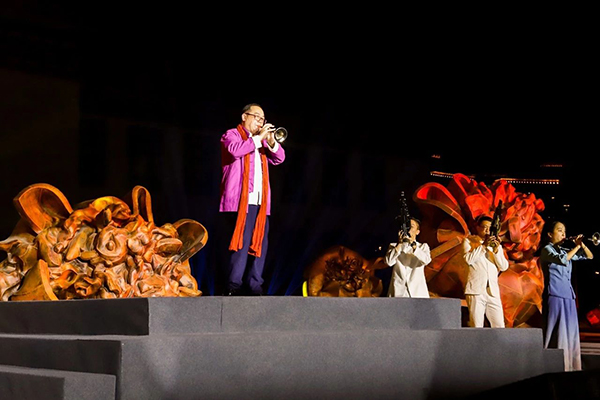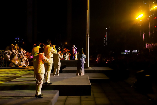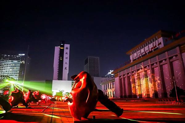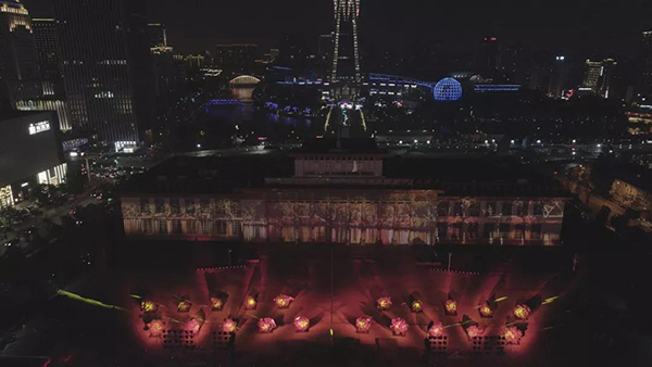 10月3日晚,一场由浙江省文艺界通力协作的大型展演在见证时代发展、充满杭城人记忆的浙江展览馆前拉开帷幕,共祝新中国成立七十周年。二十个四米高的硕大铜葵,在省艺术会堂的南广场上,布成双排阵列,扇状展开,霓灯灿烂,点亮葵盘,音舞表演与会场南墙上的大型影像互映共生,谱写一曲献给共和国七十周年庆的颂歌。