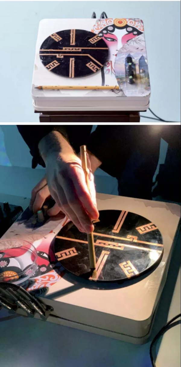 互动声音装置,录像 铁盒、亚克力盘、铜箔胶带、自制的电路板、毛笔、水
