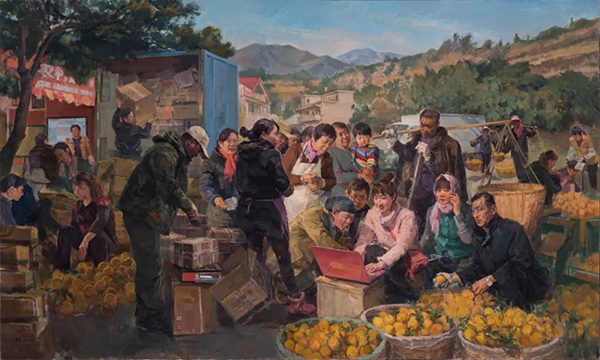 《互联网的春天——农村电商》郭健濂、褚朱炯 油画240x400cm