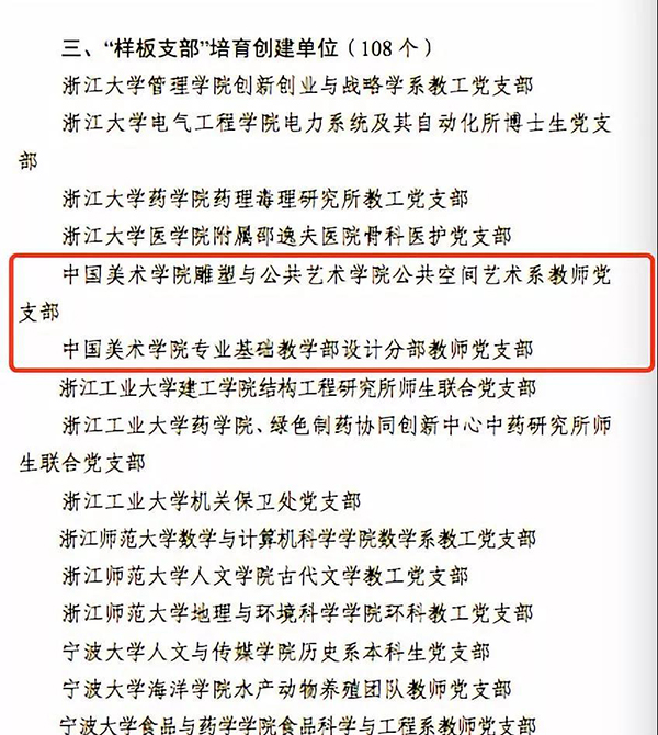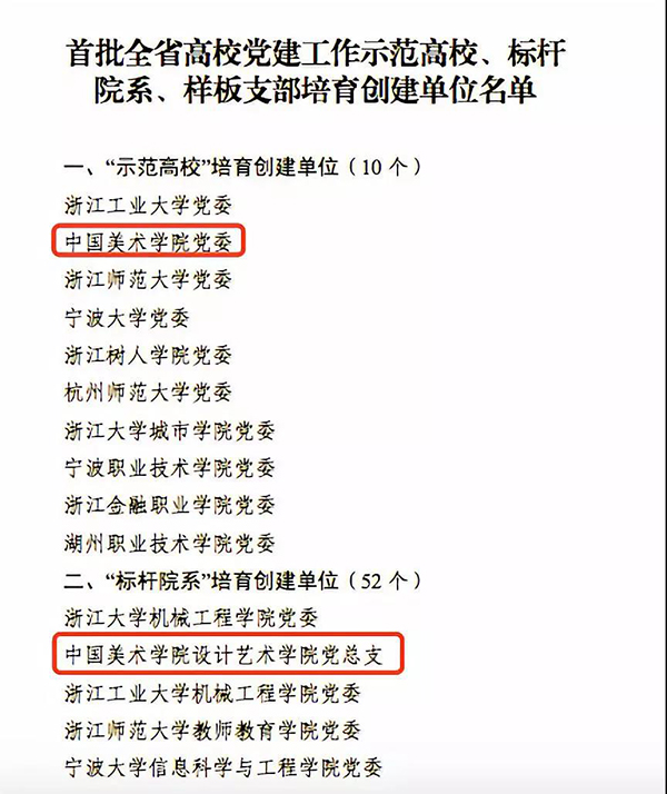 我校党委入选首批全省高校党建“双创”工作示范高校培育创建对象,设计艺术学院党总支入选首批全省高校党建“双创”工作标杆院系培育创建对象,雕塑与公共艺术学院公共空间艺术系教师党支部、专业基础教学部设计分部教师党支部入选首批全省高校党建“双创”工作样板支部培育创建对象。