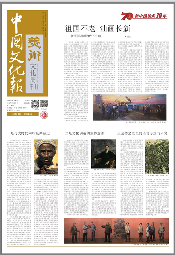 《中国文化报》9月8日美术周刊头版,以整版篇幅刊登中国美术学院院长许江撰写的《祖国不老 油画长新 ——新中国油画的成长之路》一文,中国美术学院官网特推送全文,以飨读者。