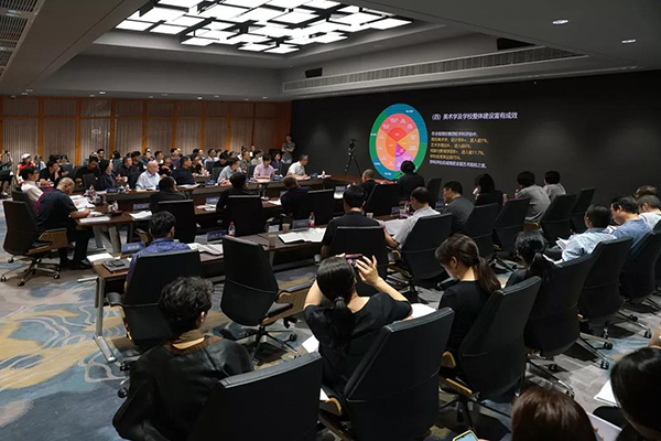 专家们听取了由副院长高世名作的学校“双一流”建设中期自评工作汇报,对学校“双一流”建设中期成效表示充分的肯定,专家组认为“中国美术学院以‘国美模式’铸炼品质,在世界一流的建设道路上展示中国艺术教育的独特魅力和东方智慧。学校‘双一流’建设体现了深厚的学术底蕴、高远的战略眼光,主动的改革精神,突出的建设成效。希望在下一阶段的建设中深化五个面向的改进举措,进一步肩负引领中国艺术教育发展的使命,建成彰显艺术学科发展规律,回应新时代国家和人民期待的中国特色世界一流艺术院校。”