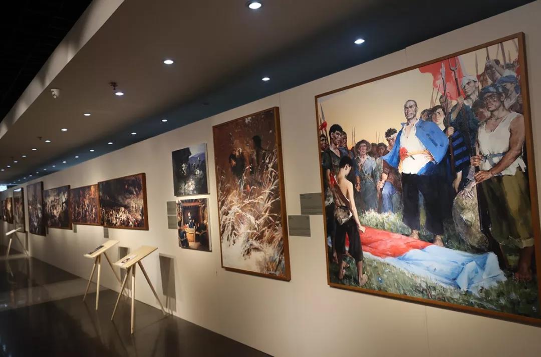 浙江图书馆馆长褚树青讲到:“本次展览以中国美院师生及校友的重大历史题材绘画为主要展示内容,反映了中华民族从“积贫积弱”“救亡图存”到“站起来”“富起来”“强起来”的壮美画卷,谱写了中华民族自强不息、实现中华民族伟大复兴的奋斗凯歌。