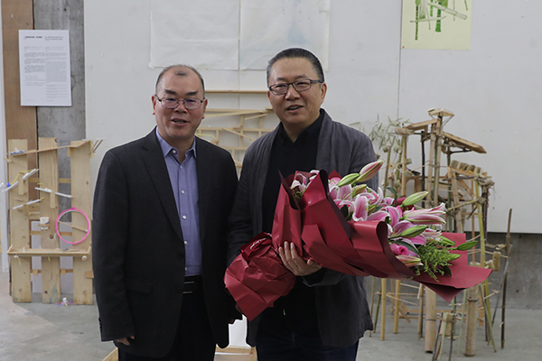 在建筑艺术学院,朱国贤与王澍亲切交流,详细询问了王澍教授教学、创作、生活等各方面的情况,高度赞誉他在建筑设计和教育方面取得的瞩目成就,希望他潜心钻研,勇攀高峰,发挥作为国家级领军人才、浙江省顶尖人才等的领军作用,为乡村振兴、浙江大花园建设、中国文化传播作出更多贡献。王澍教授表达了诚挚的感谢之情,并表示一定不辜负省委省政府的期望,为浙江发展建设提供更多的智力支持和创意支撑。朱国贤一行还参观了中国美术学院建筑艺术学院与罗德岛设计学院联合教学成果展。