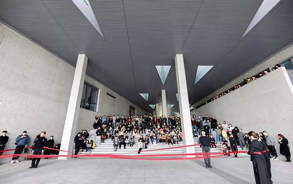 开幕式后,艺术家石冰及其团队在良渚文化艺术中心大台阶进行群体行为艺术表演。