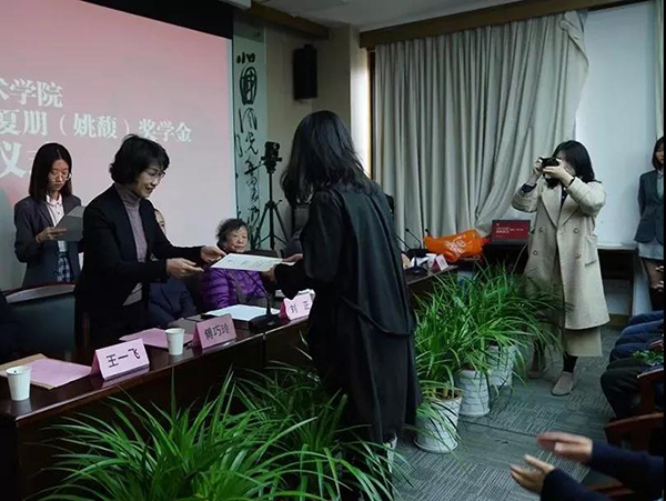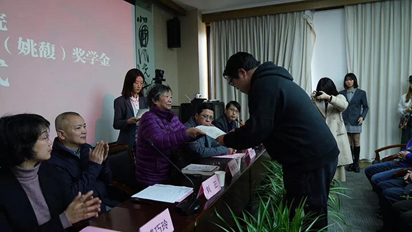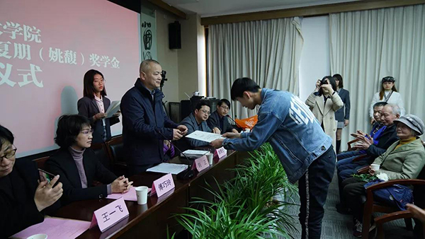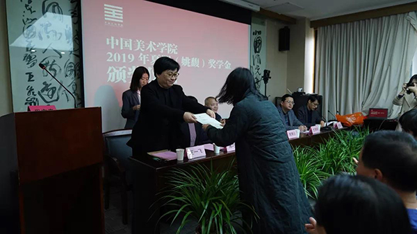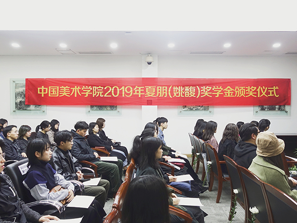 学工部部长竺照轩首先宣读了2019年夏朋(姚馥)奖学金优秀学生、先进集体名单,随后在座的领导和烈士亲属给获奖的学生和先进集体颁发了证书。金雨娴、黎勤斌、陈欣、吴季蕾、刘思陈、申舟越、徐溦、徐俊雅、孙毅恒、李天旸、吴诗倩、黄子凌、林昊阳、黄冉、李佳明、刘彦伯、张苏杭等17位同学荣获夏朋(姚馥)奖学金优秀学生,中国画与书法艺术学院2015级中国画花鸟班、绘画艺术学院2015级版画第一工作室、雕塑与公共艺术学院2016级艺术工程与科技班、建筑艺术学院2016级城市设计乙班、艺术人文学院2017级美术史论班、上海设计学院2016级室内设计班等6个集体荣获夏朋(姚馥)奖学金先进集体。上海设计学院李佳明同学代表获奖学生发言。