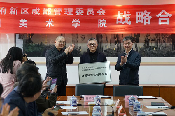 会上,王天刚与姜玉峰代表天府新区成都管委会和中国美术学院签署战略合作协议。双方共建“公园城市文创研究院”,中国美术学院建筑艺术学院副院长李凯生受聘担任公园城市文创研究院院长。