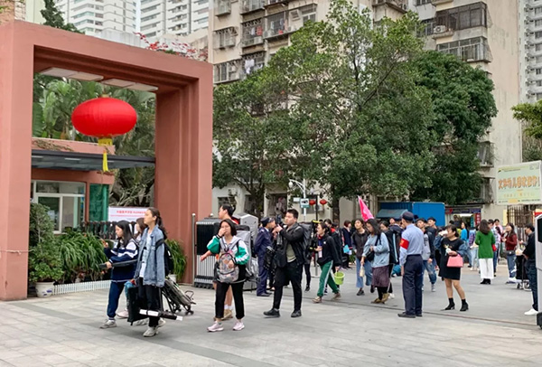 随着考生依次入场,众多考生家长伫立在校门口默默等待,热切又关心。