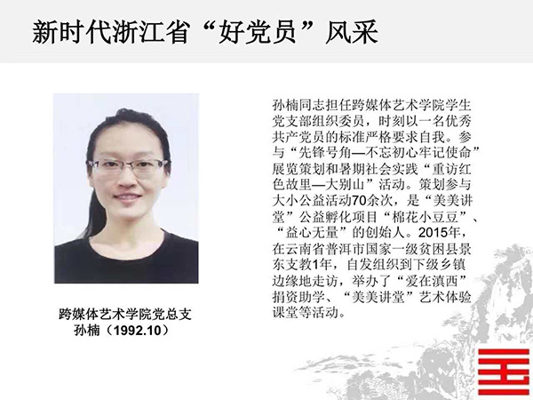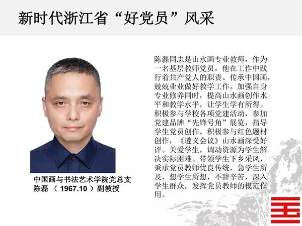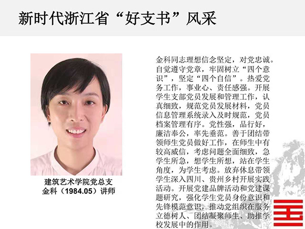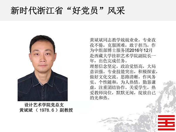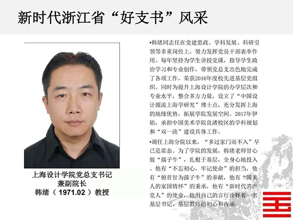 近日,省委组织部公布了“千名好支书”和“万名好党员”入选人员名单,我校上海设计学院党总支书记兼副院长、创新设计学院党总支书记兼副院长韩绪、建筑艺术学院建筑艺术系、城市设计系学生党支部书记金科入选新时代浙江省“千名好支书”;设计艺术学院副教授黄斌斌、中国画与书法艺术学院副教授陈磊、跨媒体艺术学院学生孙楠入选新时代浙江省“万名好党员”。