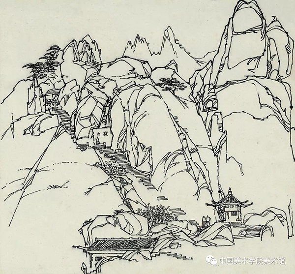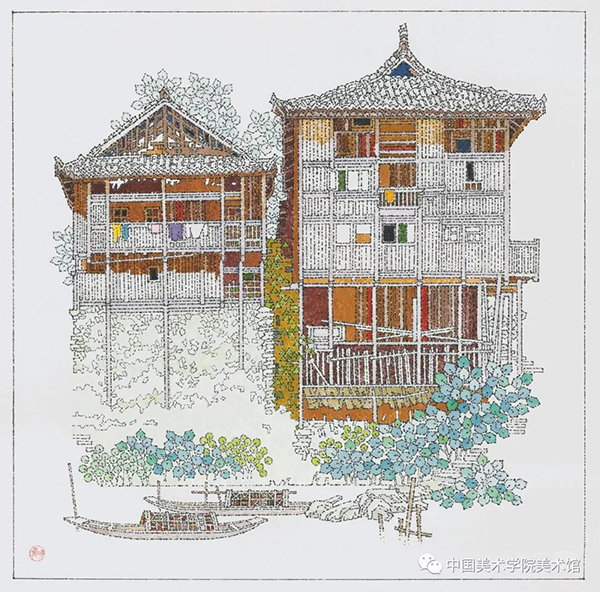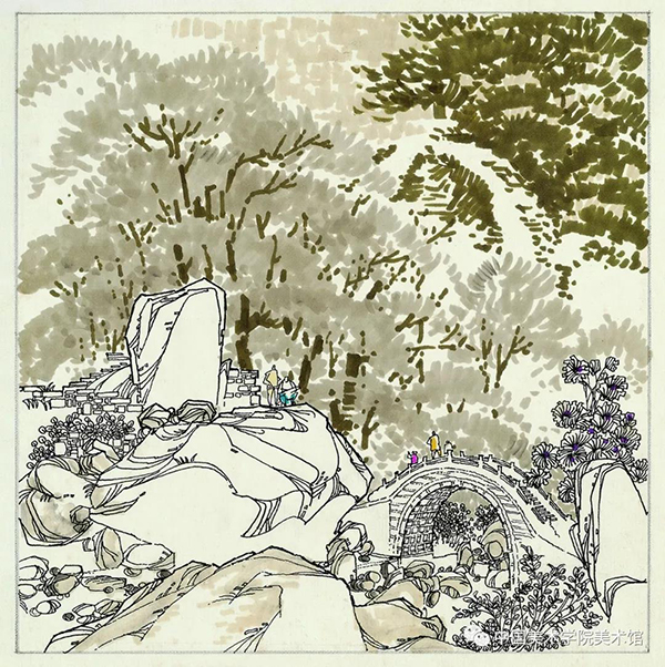 孙老师的白描多画江南小镇、浙皖山乡。作为东北出生的艺者,他却对南方山水情有独钟。所谓装饰风格,即不重远近的描画,而擅平面的排布,让山水万物立将起来。这在孙老师的风景白描中犹见匠心。用栏柱竖穿群山,用烟云流水、屋檐直廊横向铺展,并以一门一窗、一桥一树,追作细密的描划,凝成一个意味的远方。所谓「聚万根茎,蟠胸如缕」,那山水屋宇,被解成万千线条,依着纤秾的情愫,抽长凝结,生发离断,位置斟酌,呼吸决机,形成一幅幅开合有度的画面。现代的装饰画风已经极具自由,孙老师并没有往平面放骸的一路上走,而是十分珍惜他所直对的独特的风屋流水、聚落山川。「滥觞在初,流衍弥壮」,孙老师深知艺术的美源于生活,艺者的玉振金声,总是要不断回皈亲见的根源,所以作品中又有一路颇有写意之趣的小品白描,仿佛临别时对小景的最后一瞥,那屋瓦窗花亦怀风情,并赋予他的装饰风景予一种情往似赠的诚意。