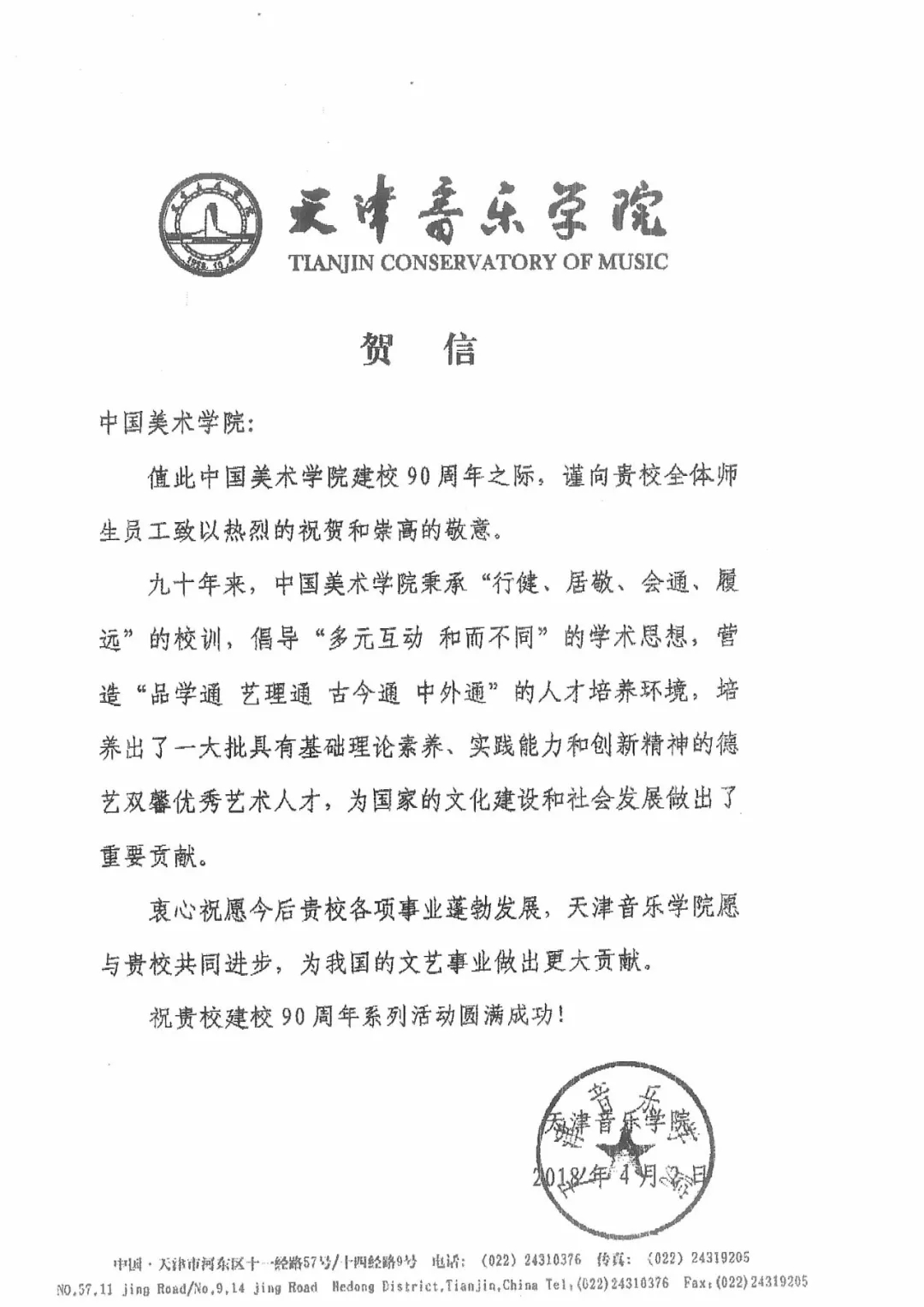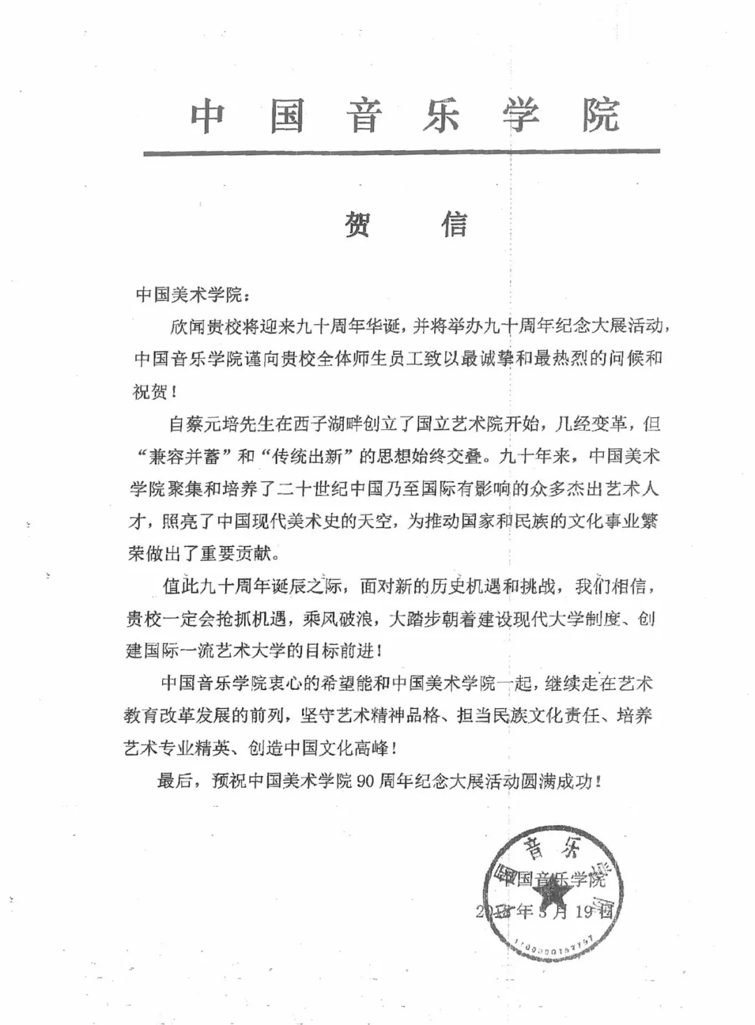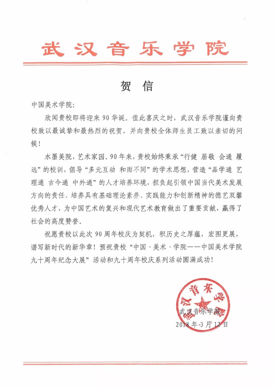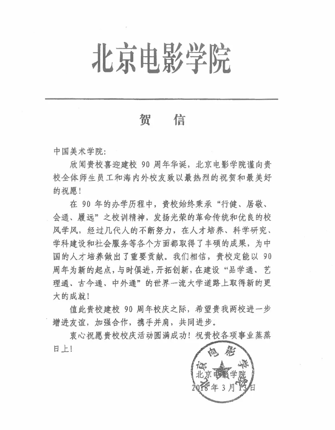 值此我校喜迎九十华诞之际,北京大学、清华大学、浙江大学、中国人民大学、中国传媒大学、中央戏剧学院、北京电影学院、中国音乐学院、天津音乐学院、四川音乐学院、武汉音乐学院、上海美术学院、北京外国语大学、北京联合大学、浙江理工大学、敦煌研究院等兄弟院校和校庆活动赞助商oppo公司发来贺信,祝贺我院90华诞,祝愿我校在今后的发展的取得更加辉煌的成绩,并希望与我校继续加强交流与合作,共谋发展。