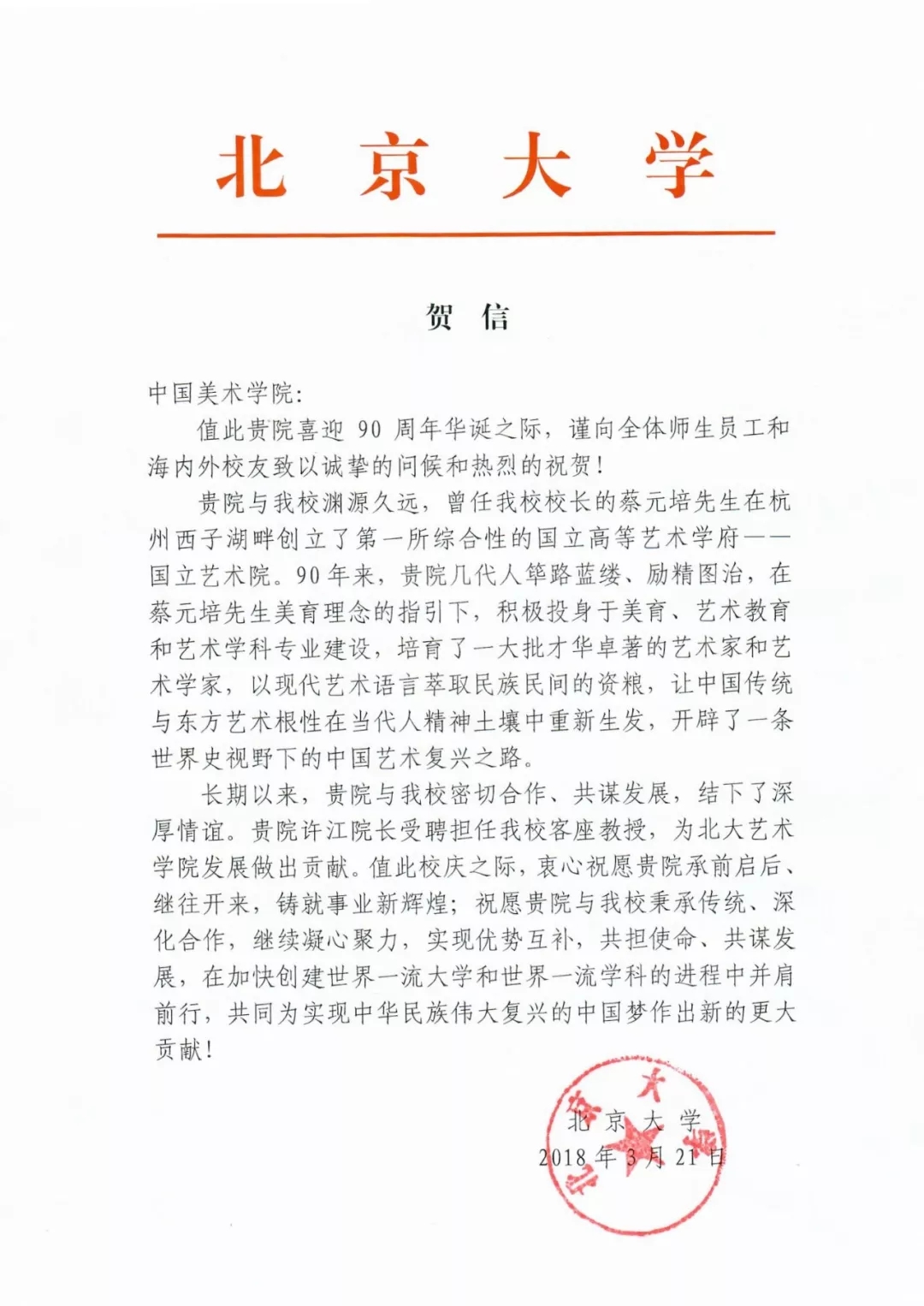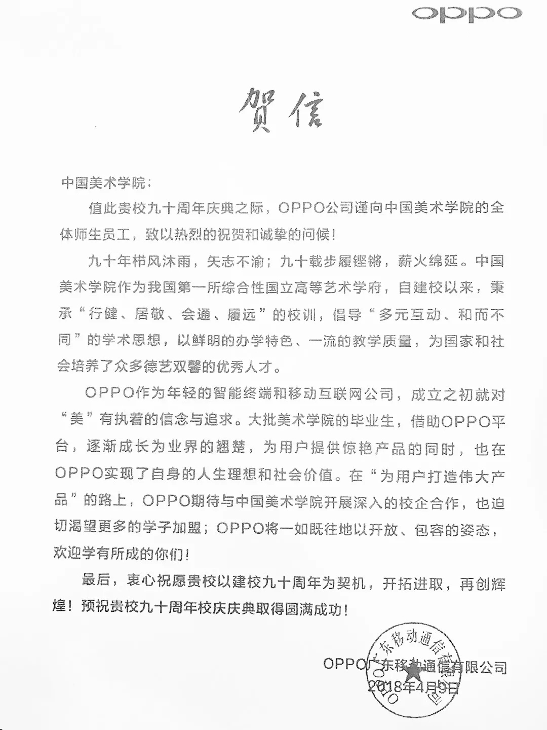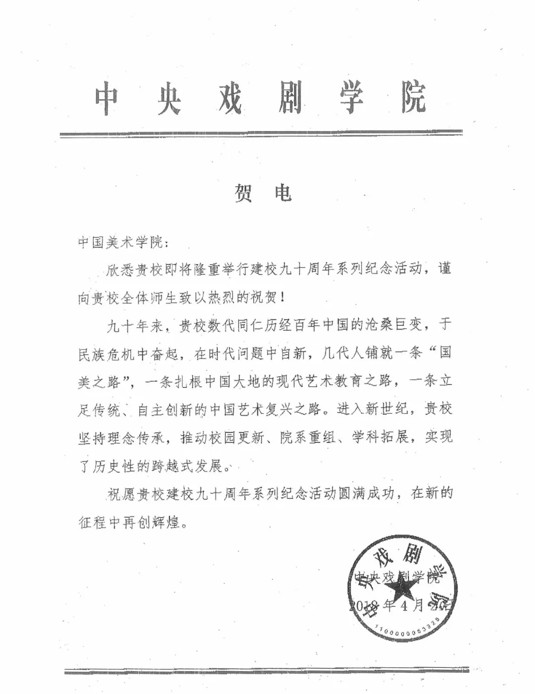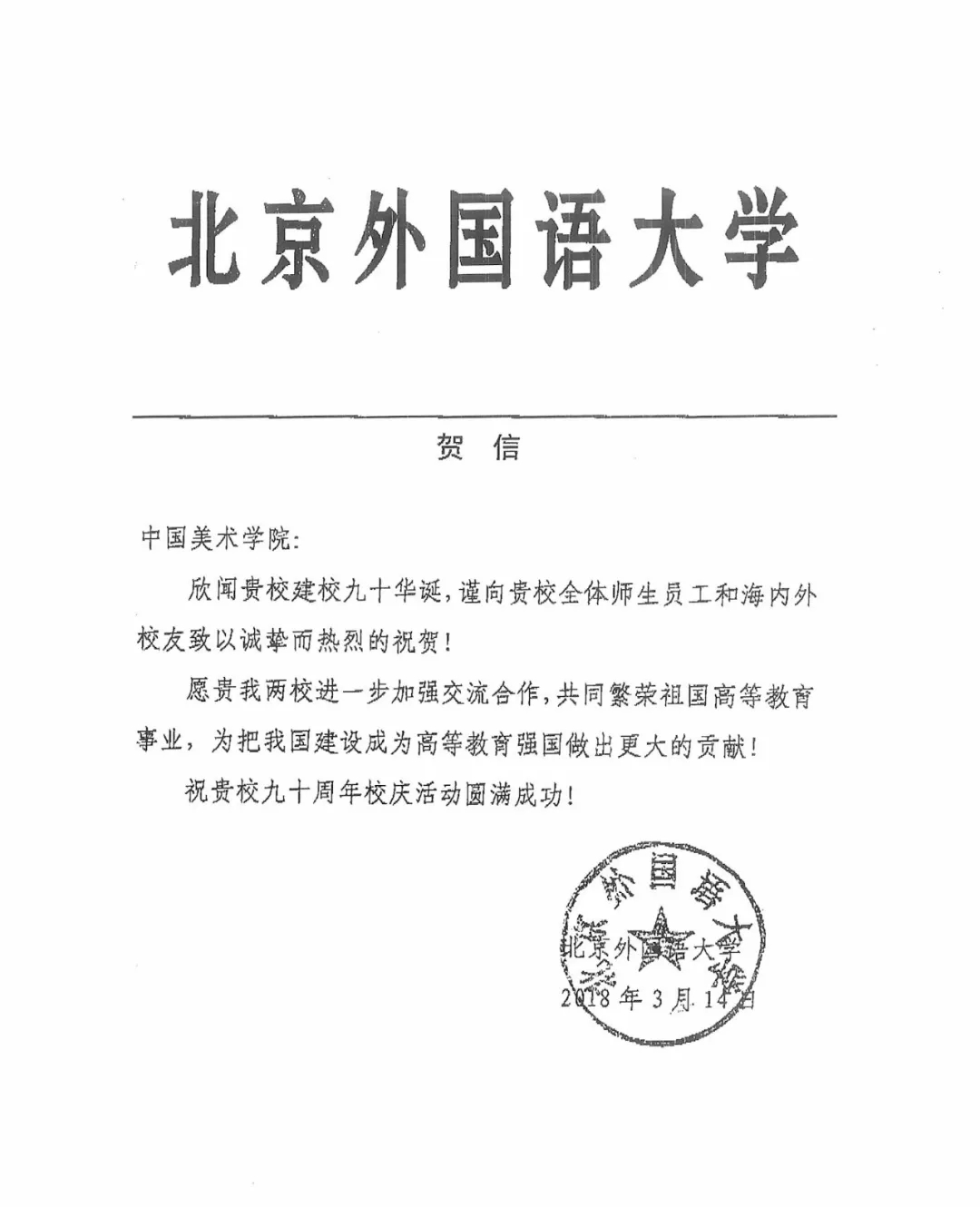 值此我校喜迎九十华诞之际,北京大学、清华大学、浙江大学、中国人民大学、中国传媒大学、中央戏剧学院、北京电影学院、中国音乐学院、天津音乐学院、四川音乐学院、武汉音乐学院、上海美术学院、北京外国语大学、北京联合大学、浙江理工大学、敦煌研究院等兄弟院校和校庆活动赞助商oppo公司发来贺信,祝贺我院90华诞,祝愿我校在今后的发展的取得更加辉煌的成绩,并希望与我校继续加强交流与合作,共谋发展。