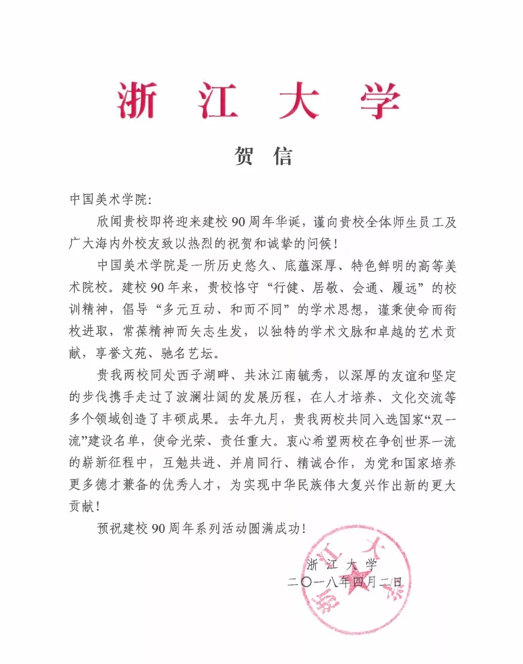 在此,中国美术学院对所有关心和支持我校校庆和事业发展的各级领导和各界朋友致以最诚挚的谢意和美好的祝愿!