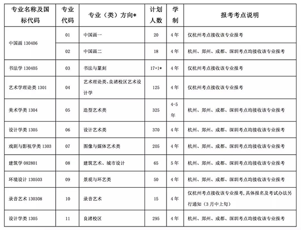 据介绍,今年招生方式仍然实行按照大类招生,分别为中国画,书法学,艺术学理论类,造型艺术类,设计艺术类,图像与媒体艺术类,建筑艺术、城市设计类、景观与环艺类,录音艺术,及今年启动面向良渚校区招生的设计学类。