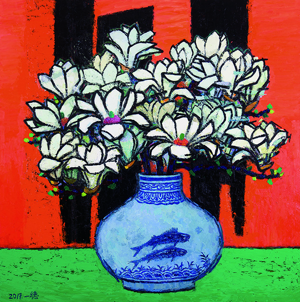 近年来,徐君萱因身体缘故少有亮相。但老先生这次依旧带来了大批量的“江南风景”,从西湖十景到京杭大运河,既有飞絮飞花的湖心亭,又有秋壑绵长的江南码头,用笔简节,色彩披纷,独有一份江南人的沉醉。金一德的展出作品则以玉兰花系列为主,依然是他的浑朴一路。素朴高洁的玉兰花是金老对杭州的最美印象,却被画作岁月狂飙,既有沧桑之气,又有翻墨之韵。
