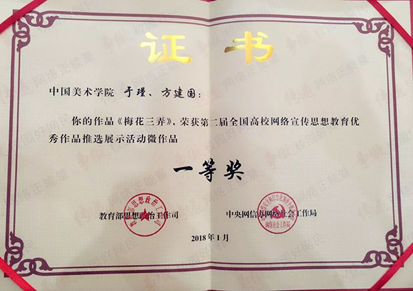 1月12日,第三次全国高校网络文化建设工作推进会顺利召开,会上表彰了第二届全国大学生网络文化节、全国高校网络宣传优秀成果推选展示活动中的优秀作品。本次活动由教育部思政司和中央网信办主办,中山大学和中国大学生在线承办,活动共征集到有效作品18981件,覆盖32个省(区、市)1142所高校。经我院影视与动画艺术学院党总支选送、校宣传部推荐的于瑾老师的动画作品《梅花三弄》获得了第二届全国高校网络宣传优秀作品推选展示活动微作品类一等奖;影视与动画艺术学院学生吴雪飞等的作品《里仁为美》获大学生网络文化节公益广告类一等奖及最佳创意奖,他的另一件作品《父亲日记》荣获优秀奖。