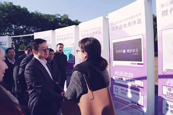 在室外一节一推选展示区,于瑾老师为中央网信办副主任高翔、教育部部长助理刘大为等领导介绍我校获奖作品。