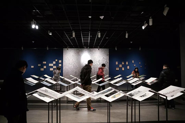 第四板块:湖山胜概——西湖主题水印版画,在展陈语言和内容方面都进行了一些突破性的尝试,目的是将新颖的陈设手段融景观、历史、文化与传统技艺于一体,不仅观照于古今西湖的历史变迁,更形象化地凝练了西湖的诗意特质。其中重点的举措有两个,一是引用了“册页”概念,在“烟波澹荡”版块先以传统册页形制连缀起新创作的西湖主题水印作品,再将册页以托架承载,突显其“水波粼粼”的视觉之美来契合西湖意象,以此作成为展厅的视觉中心;二是《新湖山胜概》的集体创作,此件巨幅拼合作品以当代观念激活历史文献,从时间、空间、性格等多维度营造文化解读的可能。