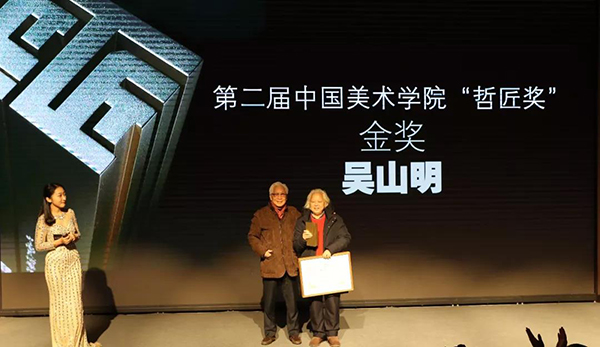 中国美术学院老教授全山石为哲匠金奖得主吴山明颁奖