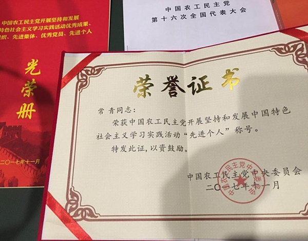 会议期间,农工党中央举行了开展坚持和发展中国特色社会主义学习实践活动的颁奖仪式。作为一名农工党员,常青教授拥护中国共产党的领导,积极参与农工党的各项活动,并受中共中央宣传部委托,以习近平同志“五四”青年节期间在北大演讲为主题,创作了大型油画《未名湖畔》;创作并捐赠了大型油画作品《邓演达主持农工党一干会议》,为农工党赢得了荣誉,是中国特色社会主义学习实践活动的积极参与者,是农工党中国美院支部的优秀代表。