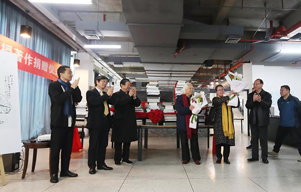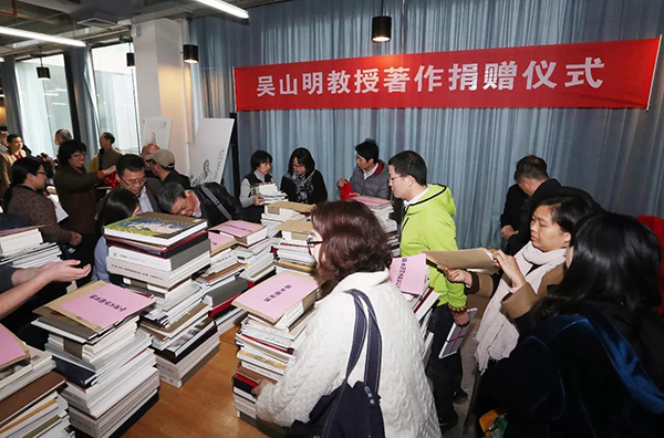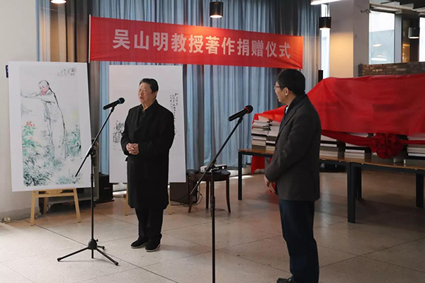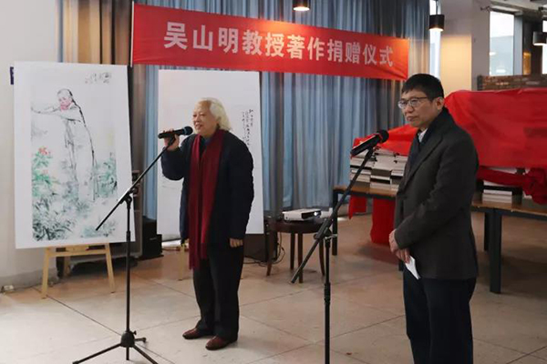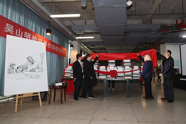11月28日,在中国美院象山校区图书馆举行了吴山明教授著作捐赠仪式。当代中国画大家、中国美术学院教授吴山明夫妇将自己所著的600余册图书,无偿捐赠给了中国美术学院、浙江大学、宁波大学、浙江美术馆等浙江21家高校图书馆和文化机构。