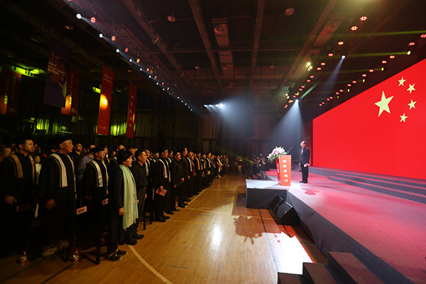 毕业典礼在庄严的国歌声中拉开帷幕。院长许江作题为《校庆在望 踏歌而行》的讲话。他展望了明年美院九十华诞的校庆,回溯了中国美院九十年的历史,带领毕业生们重温了他们四年前的入学典礼上「青山三神」——「使命精神」、「创新精神」和「诗性精神」的生命记忆。