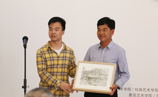 开幕式上,河长代表施颂勤发言并接受中国美术学院学生代表赠送的写生作品