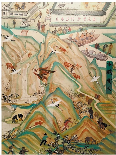 敦煌式壁画的青绿基调对应绿水青山,间或点缀的白鹭、仙鹤,表达着创作者的美好期待。