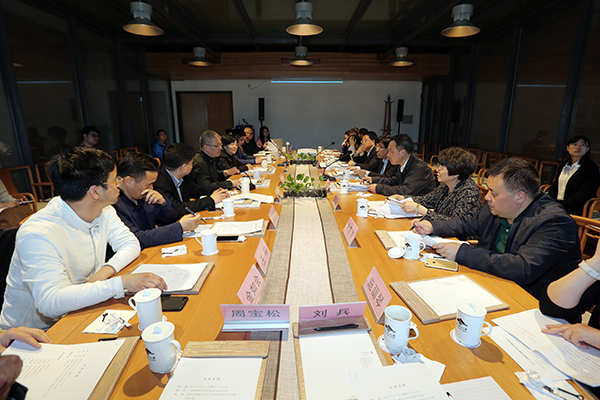 恰逢89年校庆活动,许江首先在会上向冯飞一行介绍了中国美术学院建校历史,以及新时期以来面对教育、科技、艺术的转型,中国美术学院学科专业设置与建设的调整。而后,通过一个宣传短片,向冯飞一行介绍了由西湖区人民政府、中国美术学院、浙江音乐学院共同创建的艺创小镇建设情况。