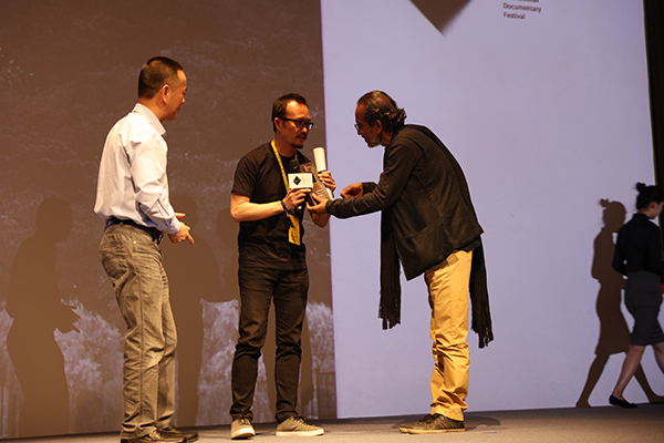 浙江省新闻出版广电局局长寿剑刚、评审团委员Nilotpal(印度)为IDF 年度优秀纪录片奖《少年小赵》的作者杜海滨颁奖