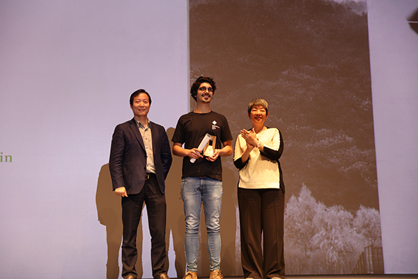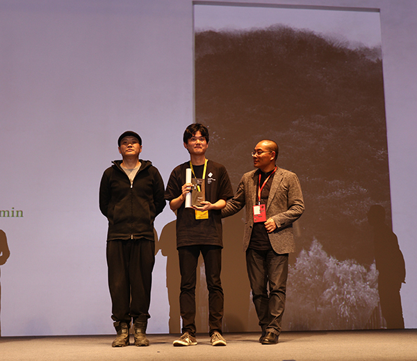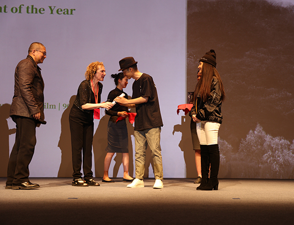 中国著名导演宁浩、评审团委员许继锋为大引勇人(日本)颁奖