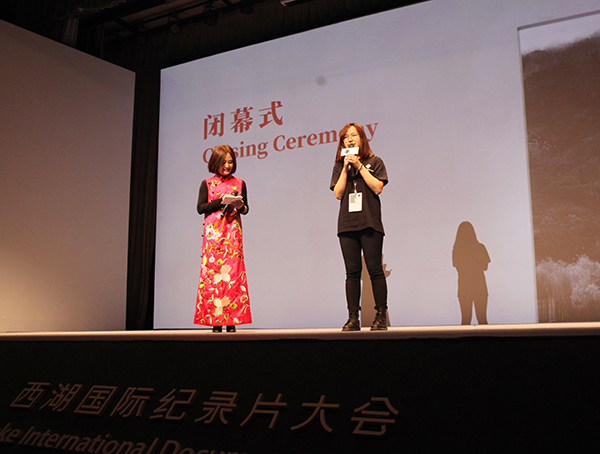 中国美术学院影视与动画艺术学院副院长苏夏教授与刘智海教授,作为首届西湖国际纪录片大会执行长上台深情感谢了浙江省新闻出版广电局、中国美术学院、评审团等各界领导与嘉宾的鼎力支持,以及整个IDF团队日夜奋战辛勤工作。