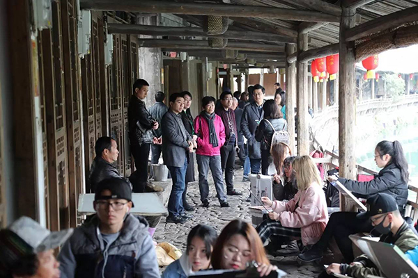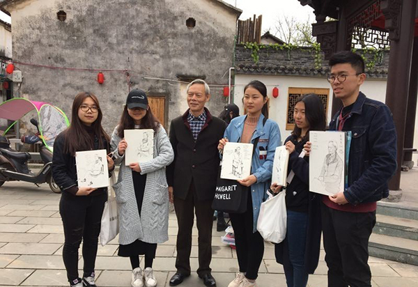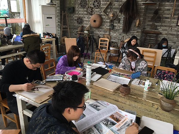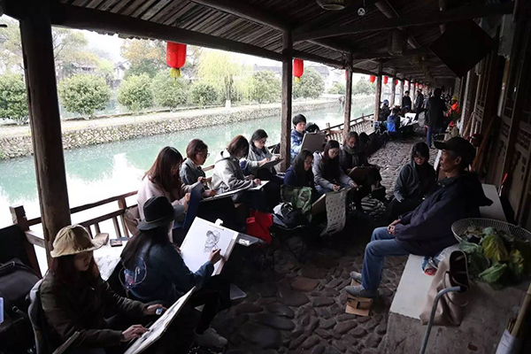 同学们散布在古镇的角落里,一笔一划勾画着古镇徽派的建筑,清澈见底的小溪。