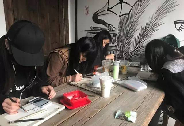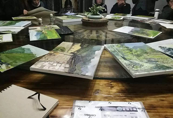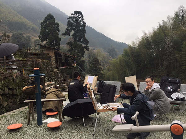 五水共治题材创作的师生们在7天的时间里,都是吃住在永嘉县岩头镇上日川村内的写生基地。白天大家出去写生创作,晚上回来继续钻研自己的作品。