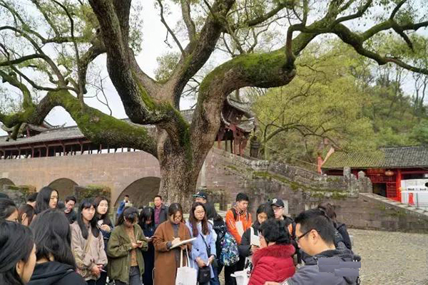 在百年古樟下同学们听村干部讲述通洲桥悠久的建筑历史;一代文豪曹聚仁的故事及凄美、感人的《廊桥遗梦》。村干部讲的有声有色,同学们听得入了迷,仿佛脑海中浮现出了那传奇且浪漫的爱情故事。