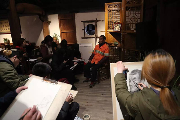 「第一次有人给我画像啊,而且还是那么多人。」河工刘火贵显得有些激动,这是他第一次当模特。