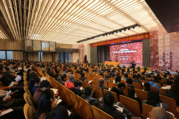 12月8日下午,中国美术学院学习第十次全国文代会精神报告会在象山校区小剧场举行,全国文联副主席、中国美术学院院长许江做专题报告,党委书记钱晓芳主持,学院党委班子成员胡钟华、王赞、孙旭东、刘正、姜玉峰、杭间、高世名、徐国强,副院级领导宋建明及全校教职工听取报告。上海设计学院设分会场同步直播。
