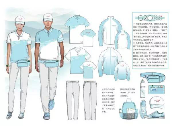 为设计G20峰会志愿者服饰,吴海燕巧妙将杭州山水相依,湖城合璧的景致融入到了设计元素中,并以G20会标为源头,借助流畅水纹依身体与服装的结构「顺势而行」,肩膀至腰间的线性联动展现京杭大运河和钱塘江交汇于杭城,象征着人与自然的紧密依存;以会标为视觉中心点延伸,寓意以杭城为起始点,链接世界,汇聚各国首脑,对话合作,共创未来。同时,领口与袖口精致的装饰细边,增添了志愿者与环境氛围的交相融合。