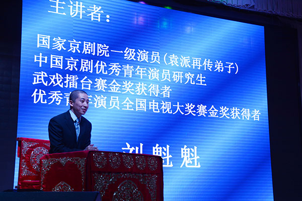 随后,国家京剧院一级演员刘魁魁进行了京剧知识讲座。他为大家介绍了京剧的起源、表演形式以及基本的行当,并通过青年演员的演示,更生动形象地让观众们对京剧的基本表演有一定的了解。