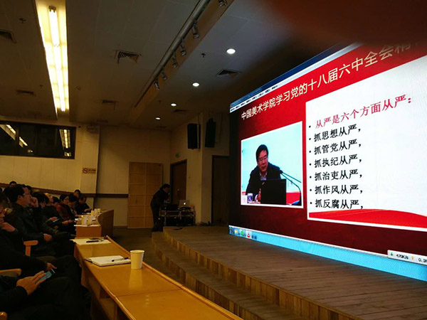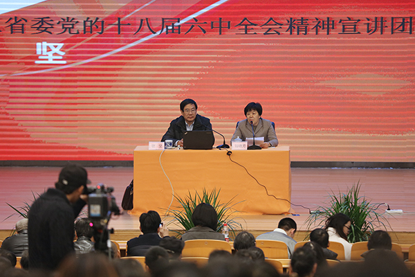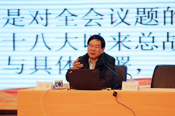 11月25日下午,我院召开学习十八届六中全会精神报告会,省委党的十八届六中全会精神宣讲团成员、我院思政特聘教授、原省委宣传部常务副部长胡坚作题为《开创全面从严治党的新境界》的专题报告。报告会设象山校区2号楼小剧场主会场,南山校区学术报告厅、上海设计学院两个分会场同步直播。我院党政领导班子成员钱晓芳、胡钟华、孙旭东、刘正、应达伟、徐国强和全体中层干部、全校师生党员、民主党派负责人、离退休党员共1200余人听取报告会。报告会由党委书记钱晓芳主持。