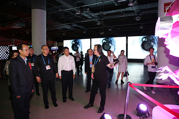 当天上午10点,中共杭州市委常委、宣传部长翁卫军,浙江省文化厅厅长金兴盛在中国美术学院院长许江陪同下参观“最设计•中国美院馆”。本次最设计·中国美院馆展览分为六大区域,包括开放媒体、冥想宇宙、空间科技三个主题展区以及人文手艺、创意生活、中德智汇三个分展区。极具未来感的虚拟现实与艺术相结合,吸引了许多观众的关注。