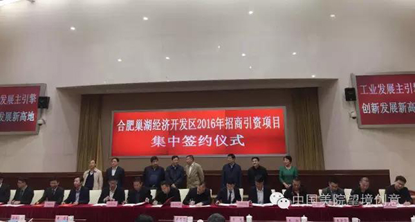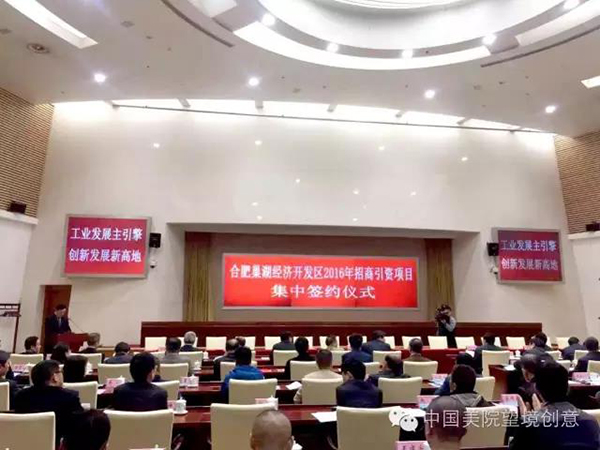 2016年10月28日,合肥巢湖经济开发区2016年招商引资项目集中签约仪式在合肥市市政府隆重举行。我院副院长姜玉峰,院长助理、上海设计学院院长吴小华,资产经营有限公司董事长余伟忠,上海设计学院党委书记韩绪和副院长陈华沙,安徽省委常委、合肥市市委书记吴存荣,副市长孔涛,常务副市长韩冰,市委常委、市委秘书长韦弋,市政府秘书长柴修发,合巢经开区管委会主任王爱华及相关职能部门负责人近百人出席了本次活动。