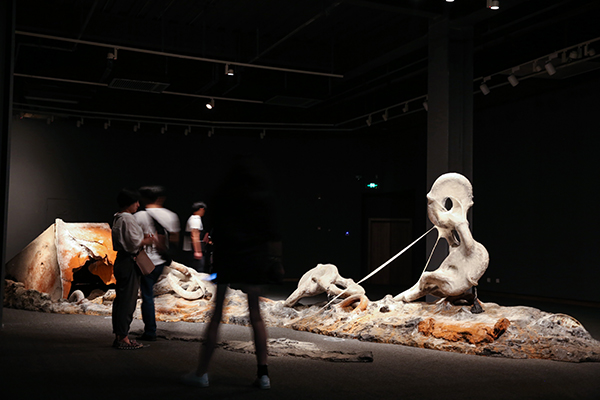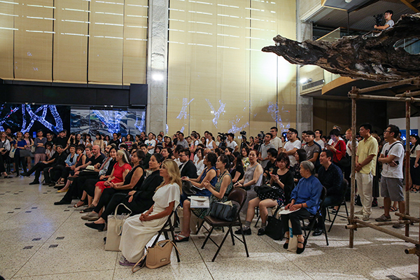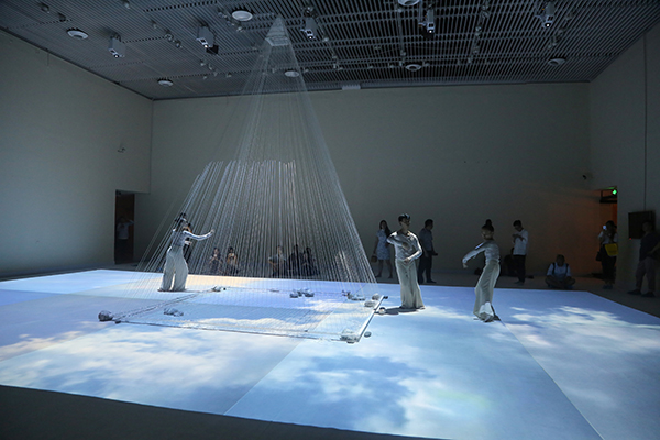 虽有汇报展的性质,但梁绍基绝不肯以老面目示人,因此有三分之一为新作,精品也做过调整,更惊艳的是,现代舞“呼吸”首次亮相,这不仅是这件作品的首次公开展示,也是梁绍基首次在个展中采用舞蹈手段。此外,展示空间的构建也采用了隐喻的方式,特别是圆形剧场,梁绍基将其分割成上下两层空间,下层是地狱,上层是天堂,“地狱”放置了两件作品:“于无声处”与“命运”,有残骸、废墟之感,“天堂”里放置的是“听蚕”,静心聆听生命之妙。