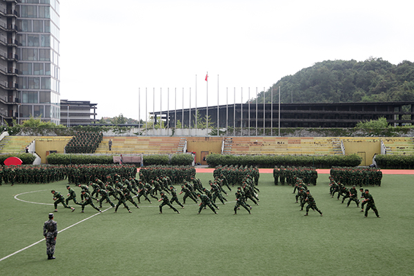 上午9点整,大会在庄严的国歌声中拉开序幕。踏着激昂的进行曲,全体新生身着戎装、精神抖擞、昂首列队,向全校师生展示了他们刻苦训练的成果。分列式表演在铿锵的解放军进行曲中进行,各方阵军姿整齐,迈着矫健的步伐通过主席台,接受院领导和部队首长的检阅。随后,3个方阵分别展开擒拿格斗、匕首操、军体拳等汇报表演,女生英姿飒爽、铿锵玫瑰绽放军营,男生声势浩大、场面气势恢宏,为军训画上了圆满的句号。